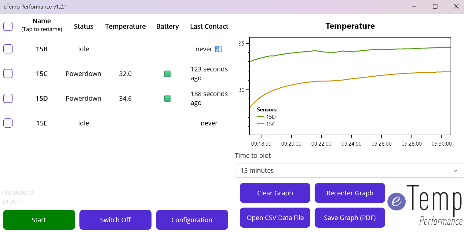 The eTemp Performance software is used to configure the sensors, real time visualization and/or post event retrieval of collected data. The connection between the sensors and the software is via Bluetooth (BLE).